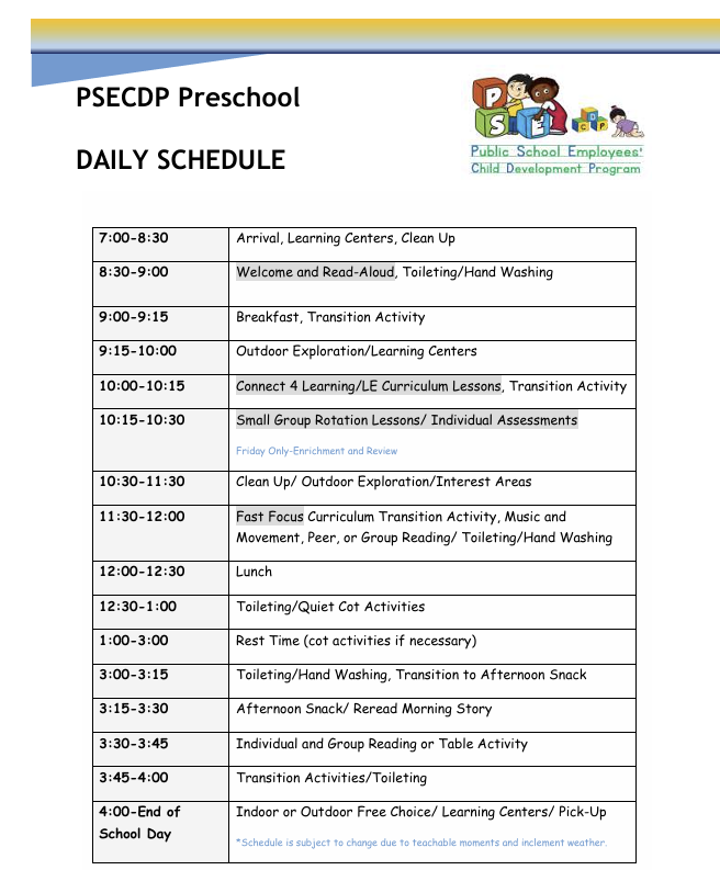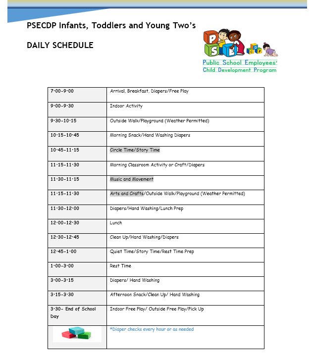 Daily Schedule Snapshot- Hammond Infants, Toddlers and Young Two's